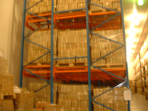 壓入式貨架主要由柱片、橫梁、軌道、運(yùn)載小車組成。軌道按一定角度傾斜固定在貨架橫梁上,運(yùn)載小車沿軌道運(yùn)行。由前方將托盤貨物推入,托盤物品置于滑座上,后來填入的會(huì)將原先的推到后方,目前可推入五個(gè)托盤;缬诨壣,滑軌本身具有傾斜角度,滑座會(huì)自動(dòng)滑向前方入口。整體結(jié)構(gòu)采用“**”原理,托盤放置在運(yùn)載小車上依次被推入貨架內(nèi)部,存取方式與貫通式貨架相同,但叉車不需要進(jìn)入貨架內(nèi)部,由于在貨架深度方向可以設(shè)計(jì)為多個(gè)托盤位置,后推式貨架的空間利用率高于普通貨架。安全性及運(yùn)轉(zhuǎn)效率都遠(yuǎn)高于貫通式貨架,廣泛應(yīng)用與冷庫、圖書、電子等行業(yè)。
