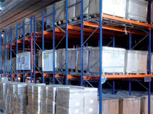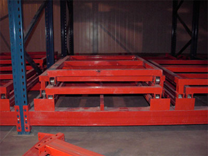 后推式貨架系統(tǒng)(也稱為壓入式貨架),此貨架系統(tǒng)高效地利用了存儲(chǔ)空間,經(jīng)常用為物流中心貨架。依據(jù)“先進(jìn)后出”的原則把貨物放置在傾斜的滾道上,運(yùn)載臺(tái)車沿軌道運(yùn)行,托盤放置在運(yùn)載臺(tái)車上依次被后推至貨架內(nèi)部,有效深度在5個(gè)托盤位,取貨時(shí)第一個(gè)拉盤提取后,下一個(gè)托盤自行滑至取貨點(diǎn),有效地利用單一通道進(jìn)行存取,尤其適用于貨物中轉(zhuǎn)區(qū)的存儲(chǔ)管理。