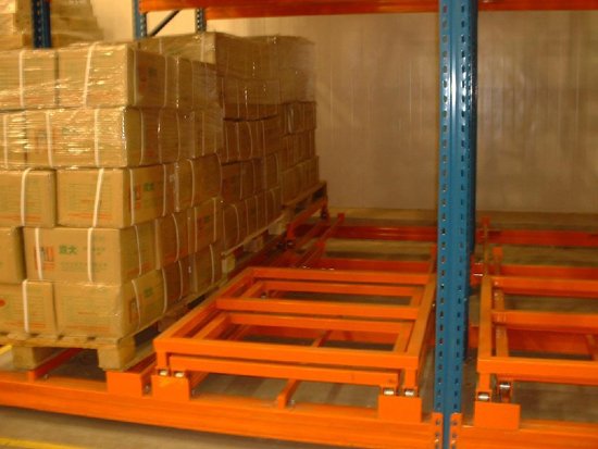 壓入式貨架非常適用于冷庫或存儲區(qū)域有限但急需增加儲位面積的場合使用,在國內(nèi)已有很多的應用。