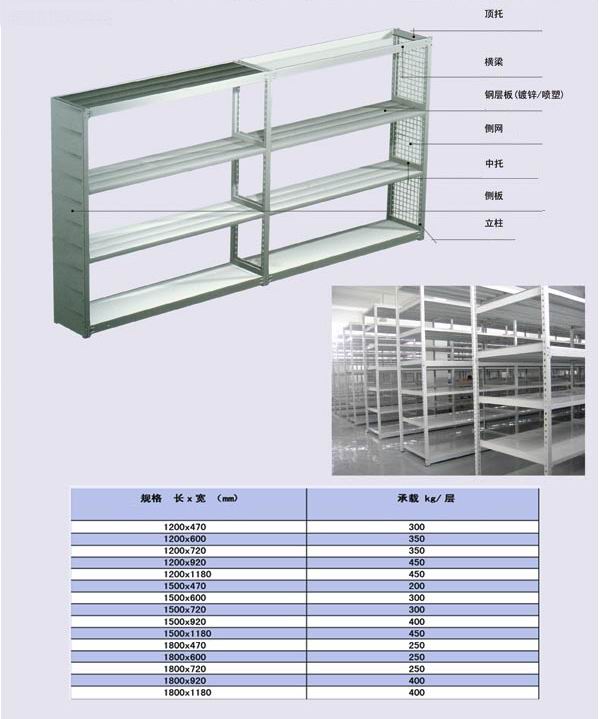 中量A型貨架,中量型貨架,擱板式貨架結構和參數(shù)對照表