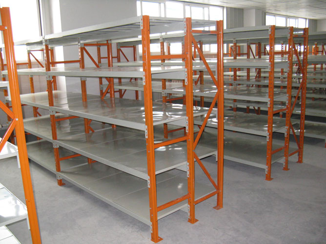 層板貨架采用扣接式結構,拆裝方便,層間距可依據(jù)貨物高度以每50mm為單位上下調節(jié),其承載范圍可達150-500kg/層。層板可以選用鋼板、木板、中密板等材料。此種貨架高度適宜,方便人工存取貨物,是中小型倉庫的倉儲產品。