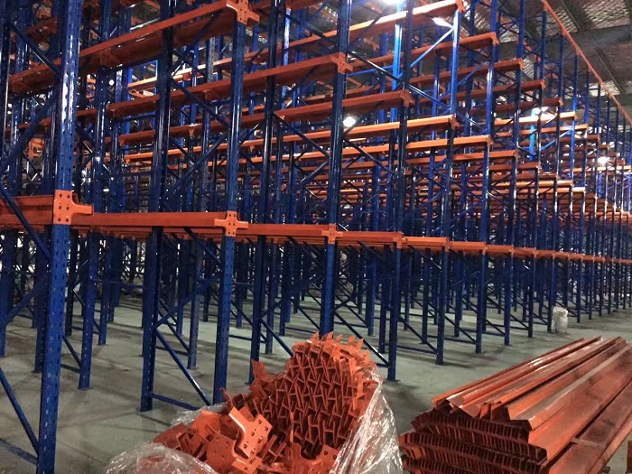 貫通貨架在同樣的空間內(nèi)比通常的托盤貨架多很多儲存能力,因為取消位于各排貨架之間的通道,將貨架合并在一起,使同一層同一列的貨物互相貫通。